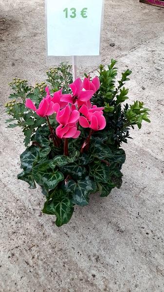 coupe de 27cm avec 1 accorus,1 mini cyclamen,1 choux d'ornement.